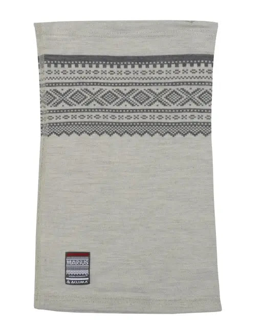 DesignWool Headover er en rund hals som kan brukes som skjerf, lue eller pannebånd. Det tradisjonelle Marius mønsteret går hele veien rundt på den ene siden av headoveren, i den andre enden er det en vevet Marius by Aclima logo.