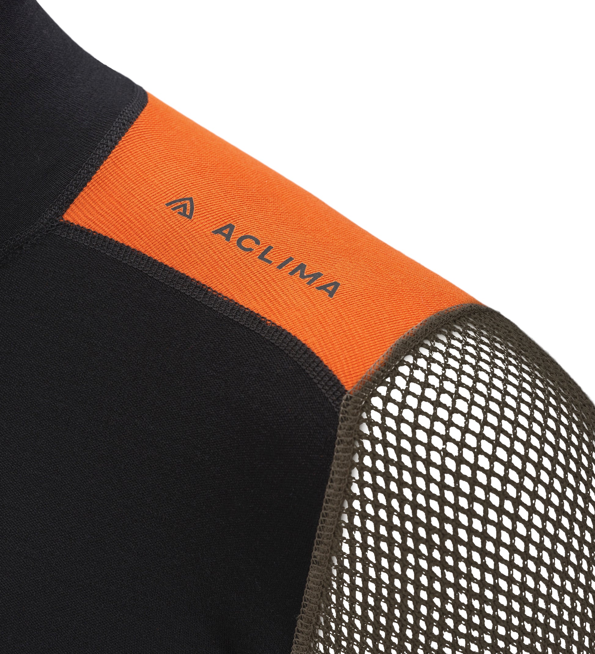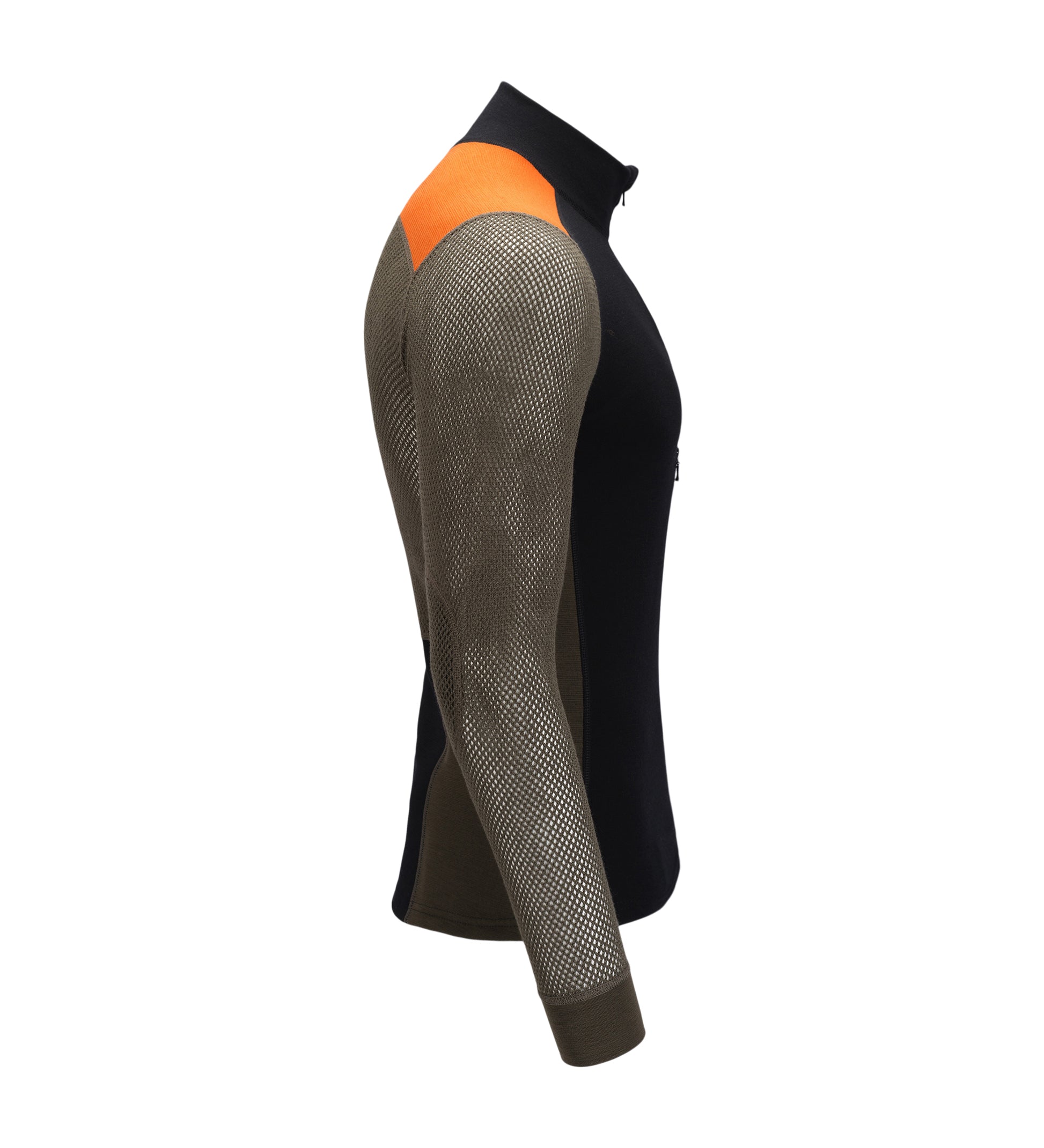 WoolNet Hybrid Mockneck er ullnetting trøye med høy hals og lange armer. Ekstra beskyttelse på albuer for økt slitasjestyrke samt ribbestrikket stoff over skuldre for god beskyttelse mot bæreremmene på sekken. Trøyen har glidelås i halsen for at man enkelt skal kunne slippe varm luft ut. Den er forsterket med strikket WarmWool stoff i 100% merino ull i front og WoolNet ullnetting på armer og rygg.
